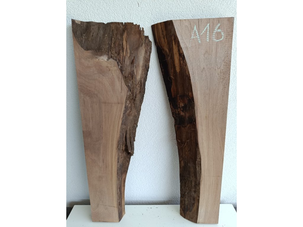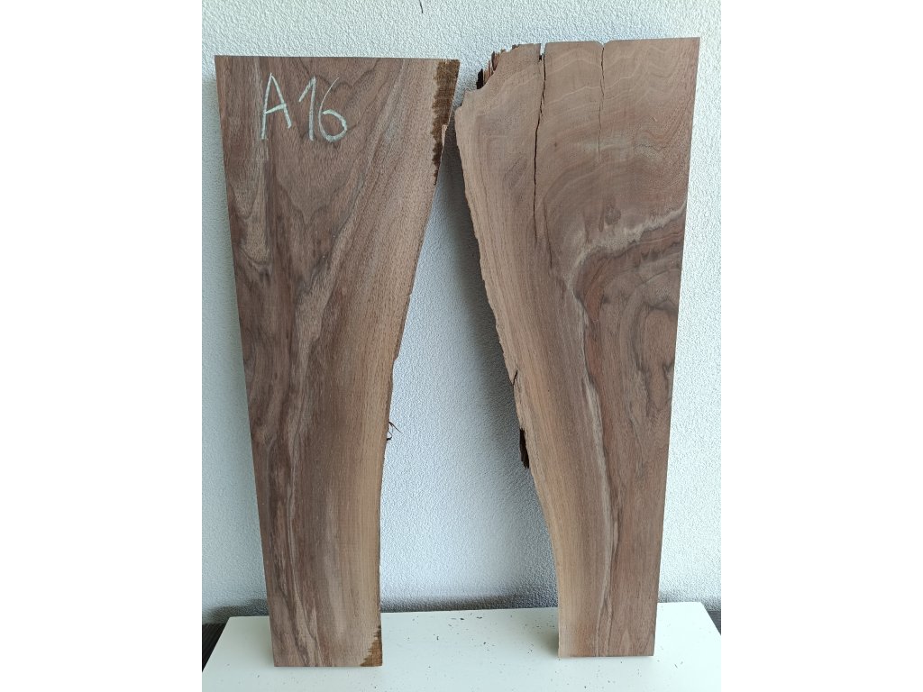 Ořešák - set atypických fošen A16 s krásnou kresbou pro epoxidovou tvorbu, rozměr délka 89 cm x šířka 33/58 cm (přiložené k sobě bez mezer), tloušťka 52mm. Hmotnost 12,5 kg. Vysušené v sušárně na 8%, srovnáno a zkalibrováno na CNC a broušeno na zrnitost 80. Připraveno k zalití.