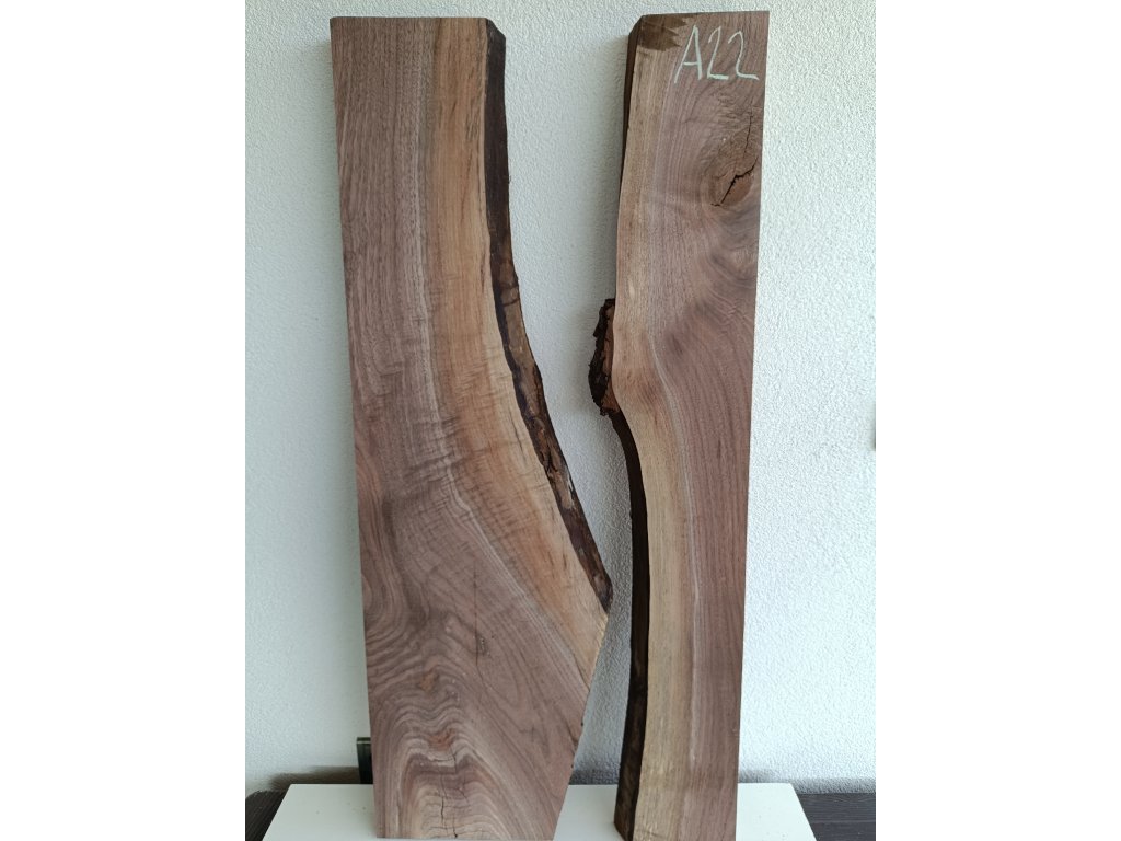 Ořešák - set atypických fošen A22 s krásnou kresbou pro epoxidovou tvorbu, rozměr délka 115 cm x šířka 37/51 cm (přiložené k sobě bez mezer), tloušťka 48mm. Hmotnost 14,5 kg. Vysušené v sušárně na 8%, srovnáno a zkalibrováno na CNC a broušeno na zrnitost 80. Připraveno k zalití.