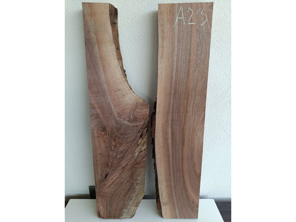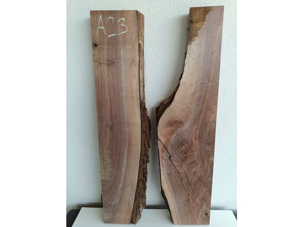 Ořešák - set atypických fošen A23 s krásnou kresbou pro epoxidovou tvorbu, rozměr délka 100 cm x šířka 32/48 cm (přiložené k sobě bez mezer), tloušťka 54mm. Hmotnost 13 kg. Vysušené v sušárně na 8%, srovnáno a zkalibrováno na CNC a broušeno na zrnitost 80. Připraveno k zalití.