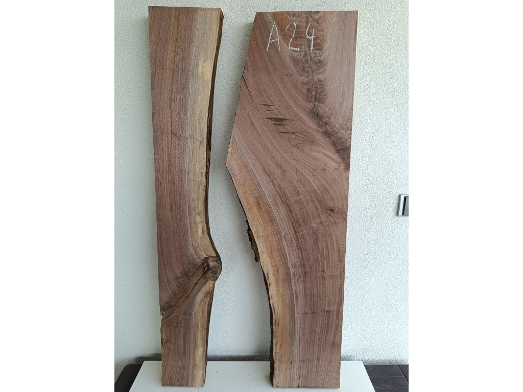 Ořešák - set atypických fošen A24 s krásnou kresbou pro epoxidovou tvorbu, rozměr délka 123 cm x šířka 39/55 cm (přiložené k sobě bez mezer), tloušťka 54mm. Hmotnost 19 kg. Vysušené v sušárně na 8%, srovnáno a zkalibrováno na CNC a broušeno na zrnitost 80. Připraveno k zalití.