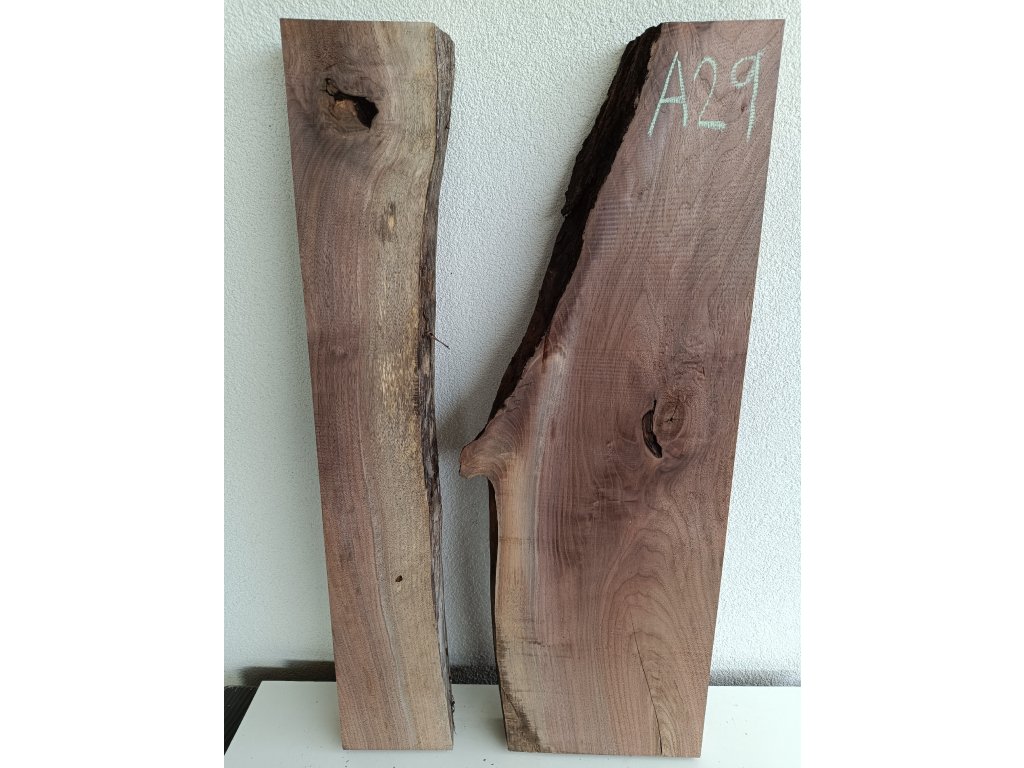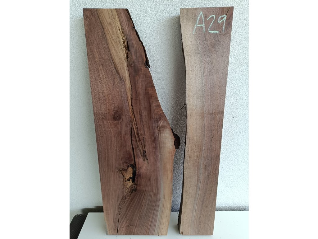 Ořešák - set atypických fošen A29 s krásnou kresbou pro epoxidovou tvorbu, rozměr délka 87 cm x šířka 30/43 cm, tloušťka 54mm. Hmotnost 11,5 kg. Vysušené v sušárně na 8%, srovnáno a zkalibrováno na CNC a broušeno na zrnitost 80. Připraveno k zalití.
