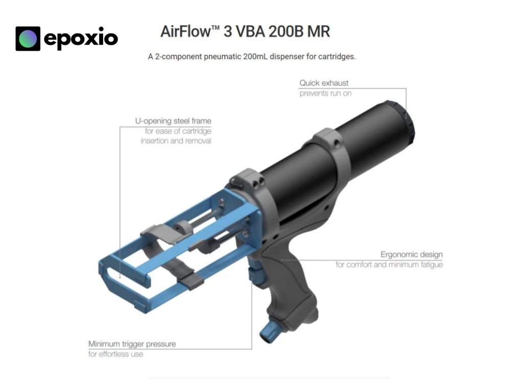VBA (MR) 200B je profesionální pneumatická aplikační pistole speciálně navržená pro práci s duálními 2K kartušemi Sulzer Mixpac o objemu 200-248 ml. Tento univerzální nástroj je ideální pro aplikaci dvousložkových materiálů v různých směšovacích poměrech.