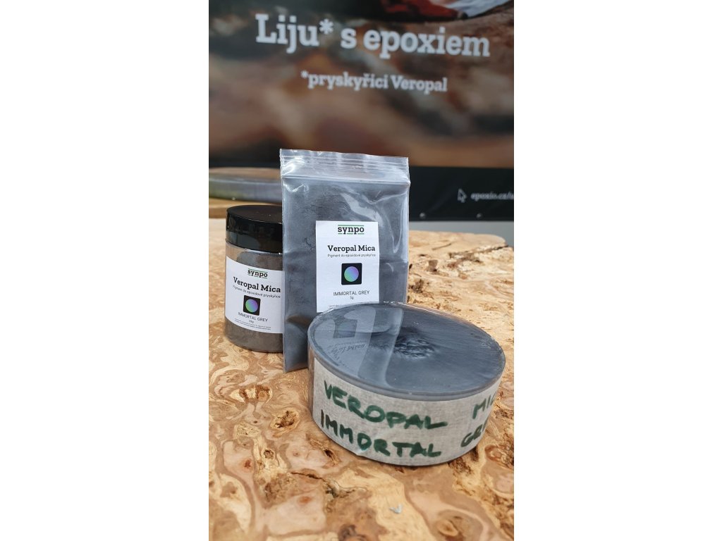 VEROPAL MICA pigment IMMORTAL GREY je úchvatný metalický pigment se sytou světle šedou barvou a jemnými metalickými odlesky. Díky malým mikročásticím slídy o velikosti 10-60 mikrometrů se dobře udržuje ve vznosu, takže méně klesá při odlévání ke dnu. To potom umožňuje vytvářet metalické, perleťové, duhové a jiné efekty a díky tomu si získává oblibu jak u profesionálů, tak i kutilů pro epoxidové lití, výrobu mýdla, svíček, automobilových barev, slizu, šperků, sklolaminátu atd. Vhodný k tónování, ztmavování či zesvětlování jiných metalických pigmentů. Světlostálý, dlouhodobě testovaný.